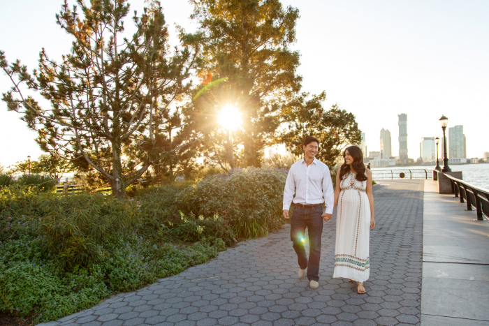 Parents-to-be holding hands next to the water