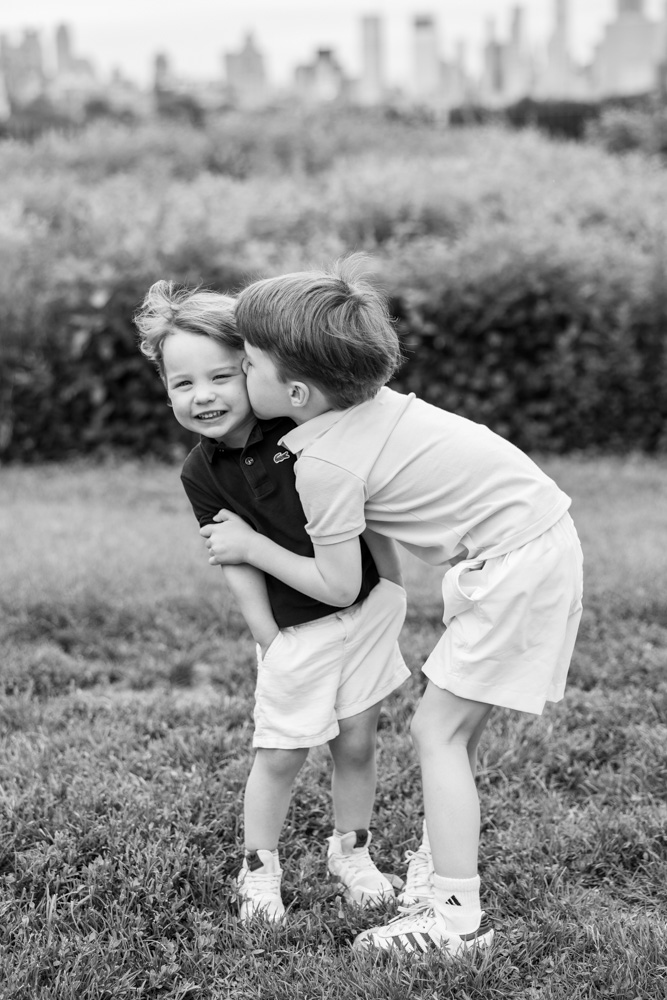 BW of 2 brothers having fun in front of the camera with manhattan skyline in background