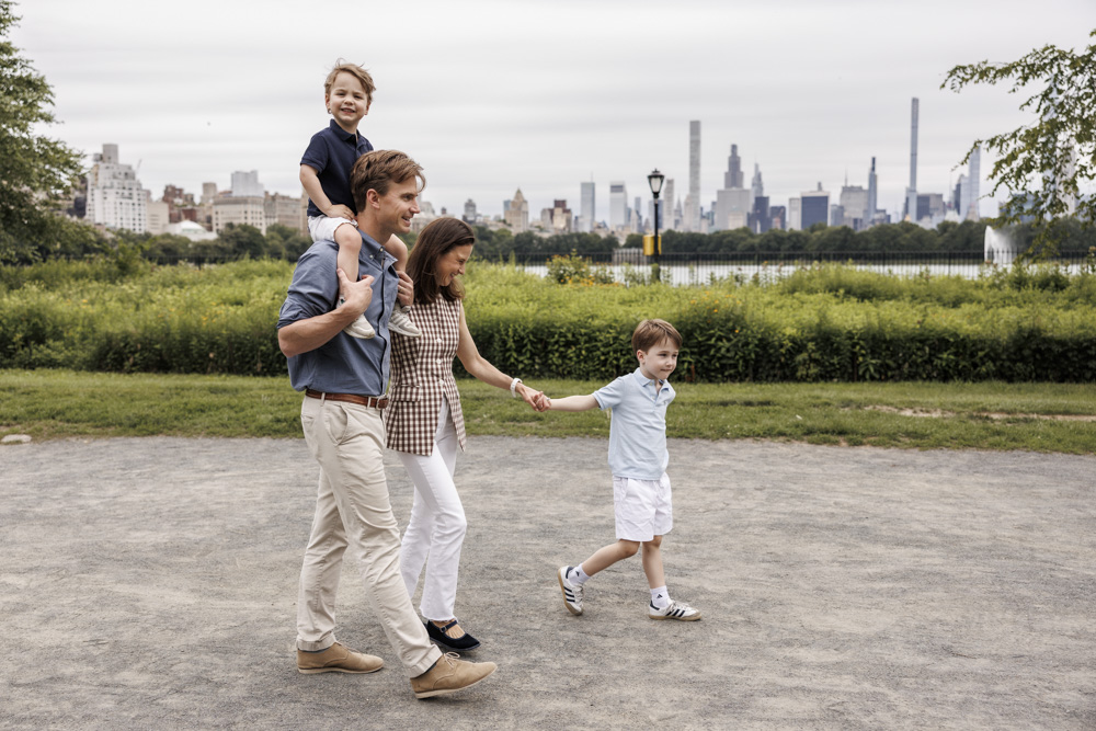 family of four walking through a park with nyc skyline in the background