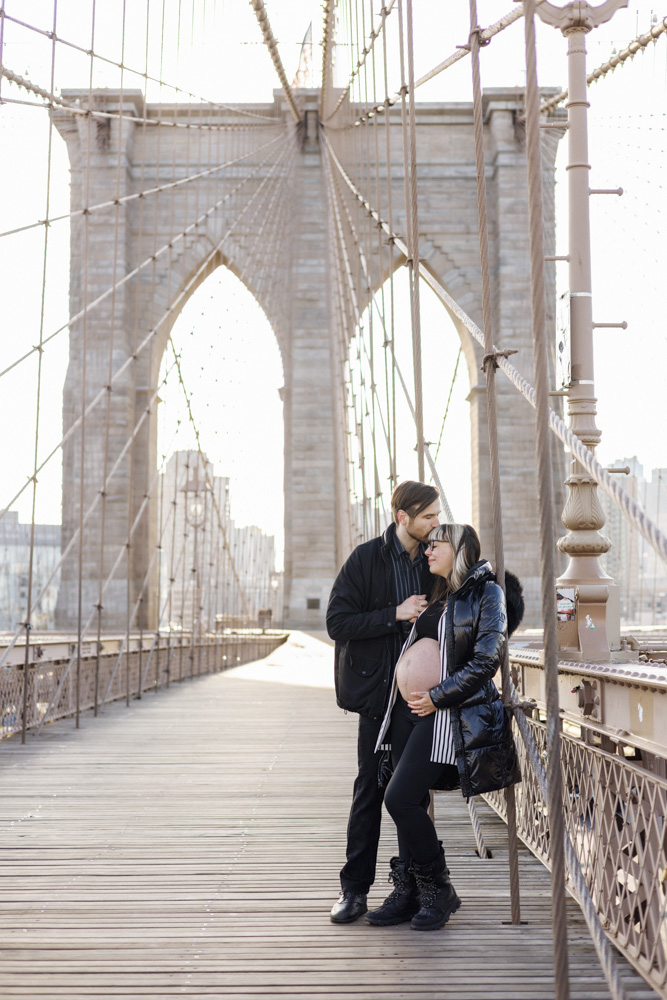 cool pregnant couple posing on brooklyn bridge