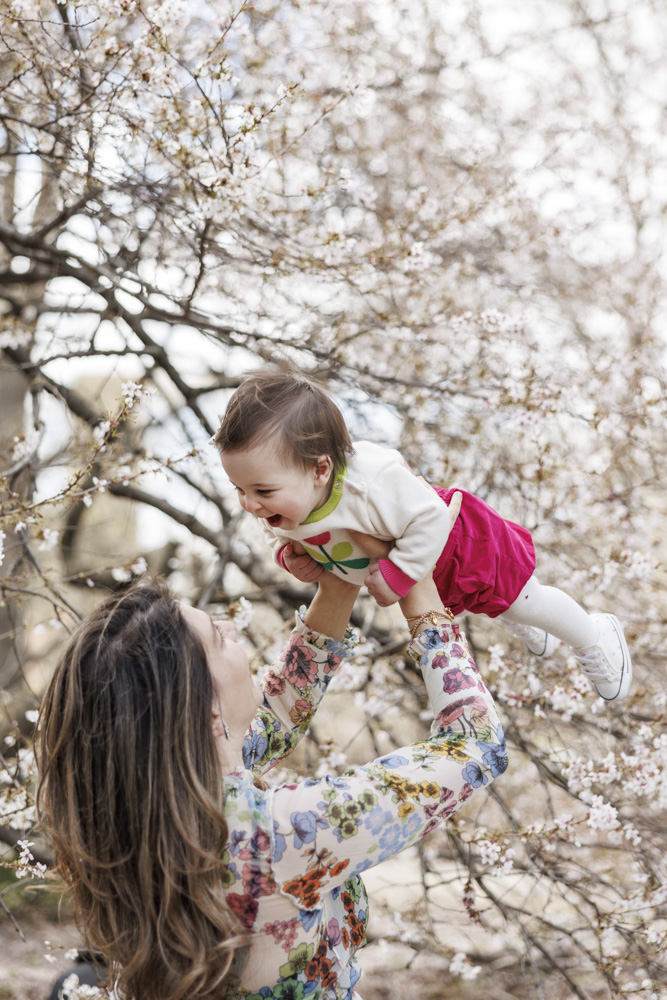 mom lifting her little girl under cherry tree at cherry hill in central park in new york