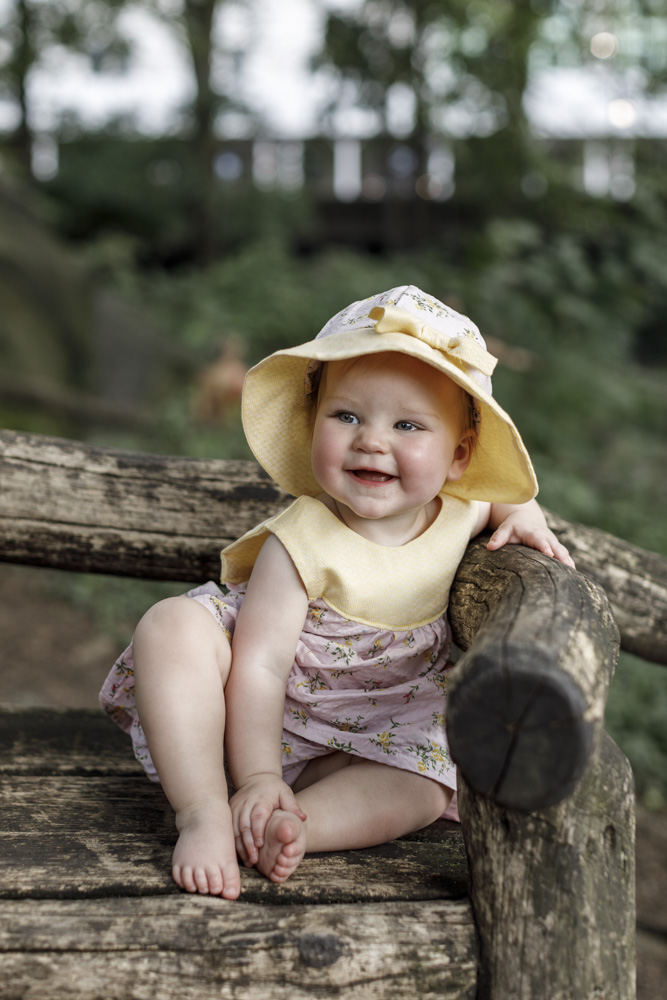 little girl with hat sitting on bench at the pond in central park in nyc