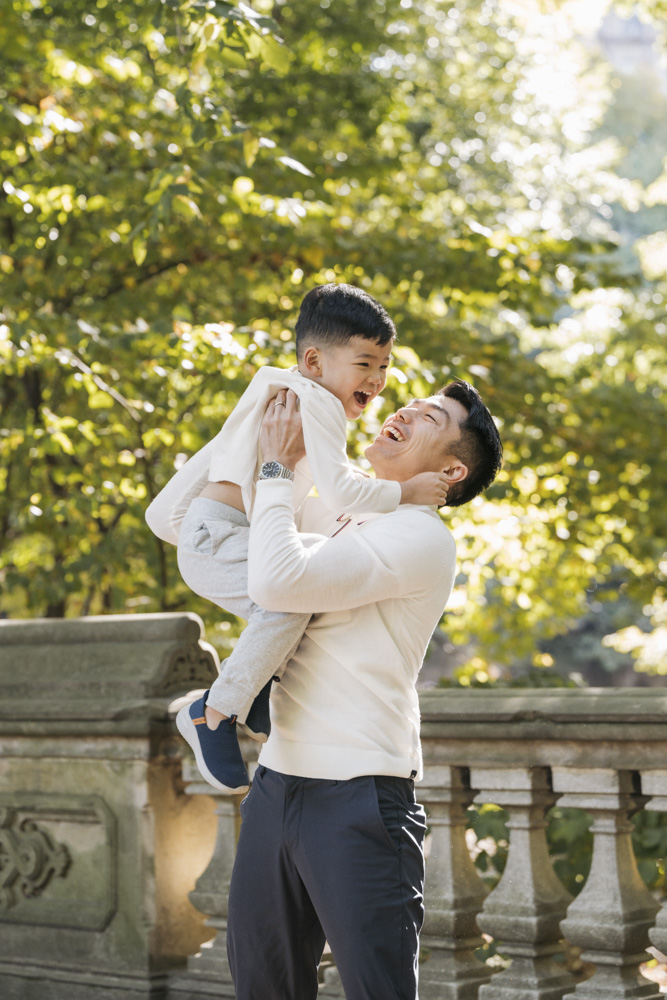 dad lifting up his son for a fun photo at glade arch in central park new york