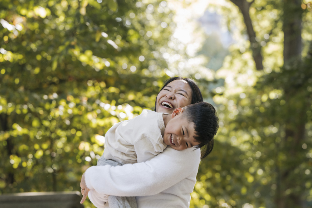 mom cuddling her son, both smiling, at glade arch in central park new york