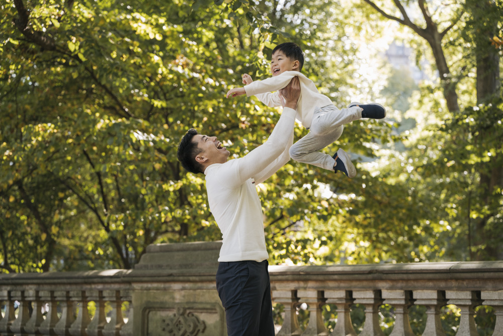 dad lifting up his son for a fun photo at glade arch in central park new york