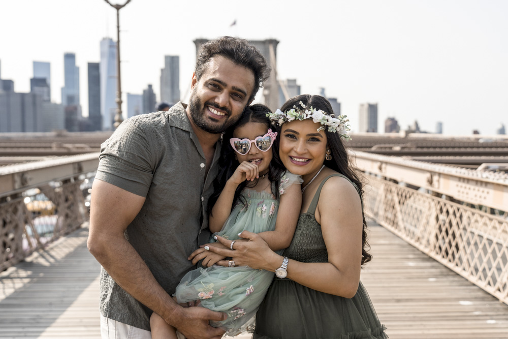 pregnant woman with flower wreath posing on brooklyn bridge with her husband and her daughter with cool sun glasses