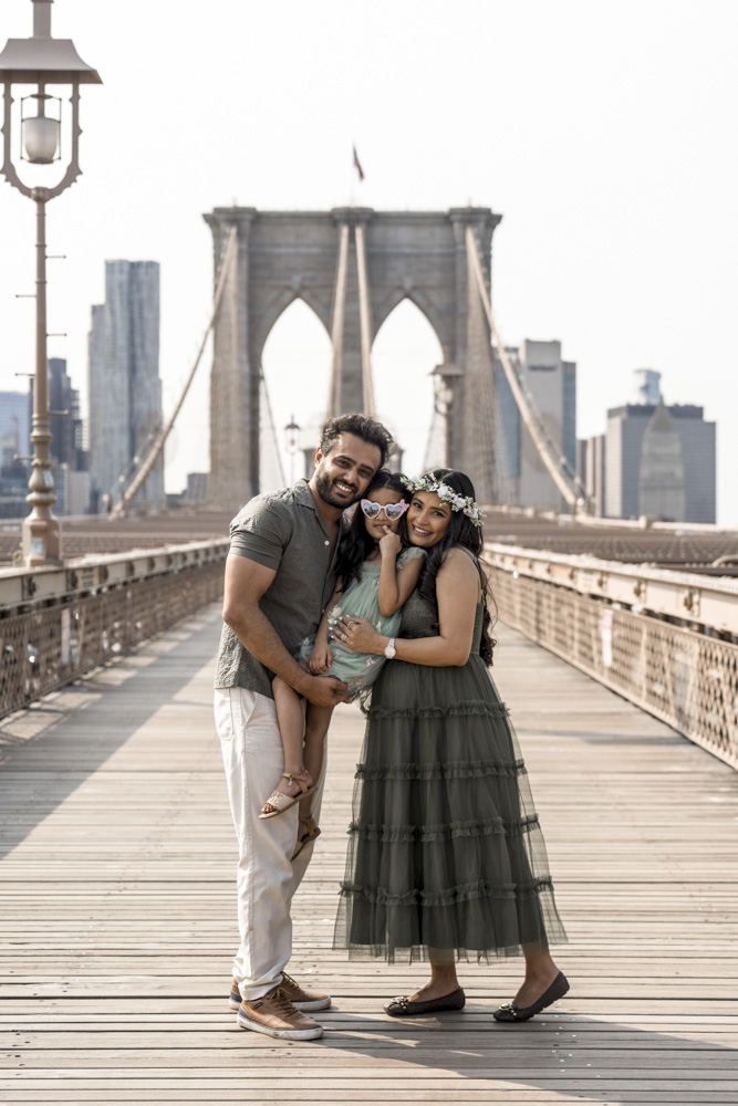 pregnant woman with flower wreath posing on brooklyn bridge with her husband and her daughter with cool sun glasses