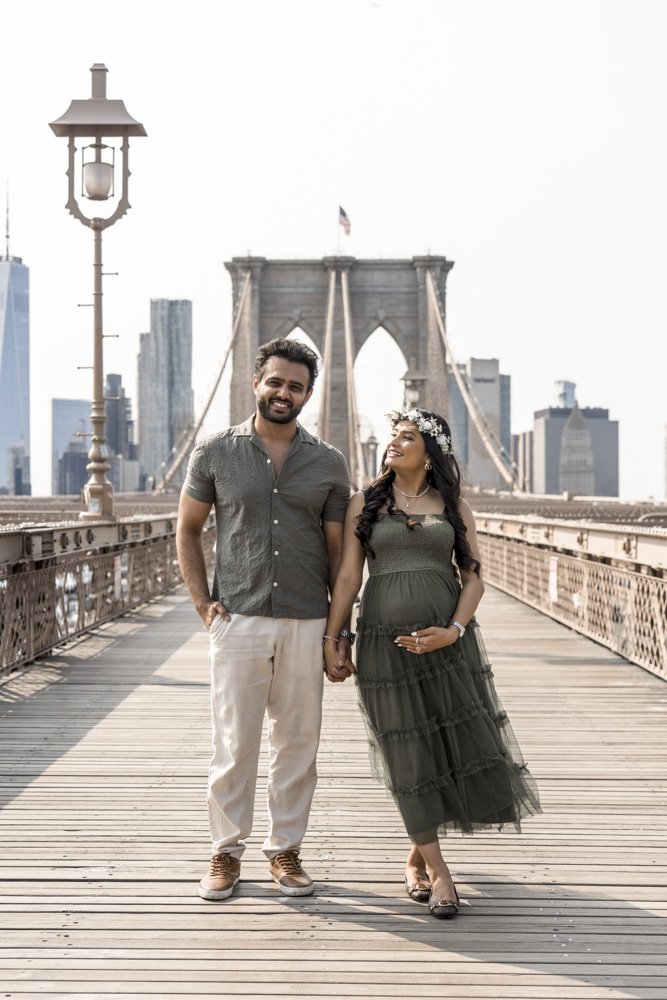 pregnant woman with flower wreath posing on brooklyn bridge with her husband