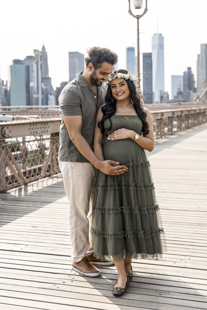 pregnant woman with flower wreath posing on brooklyn bridge with her husband