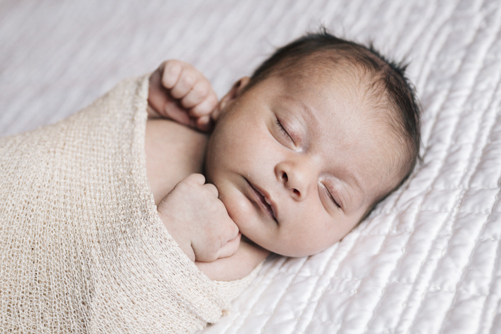 close up of swaddled newborn baby during an in home photo shoot