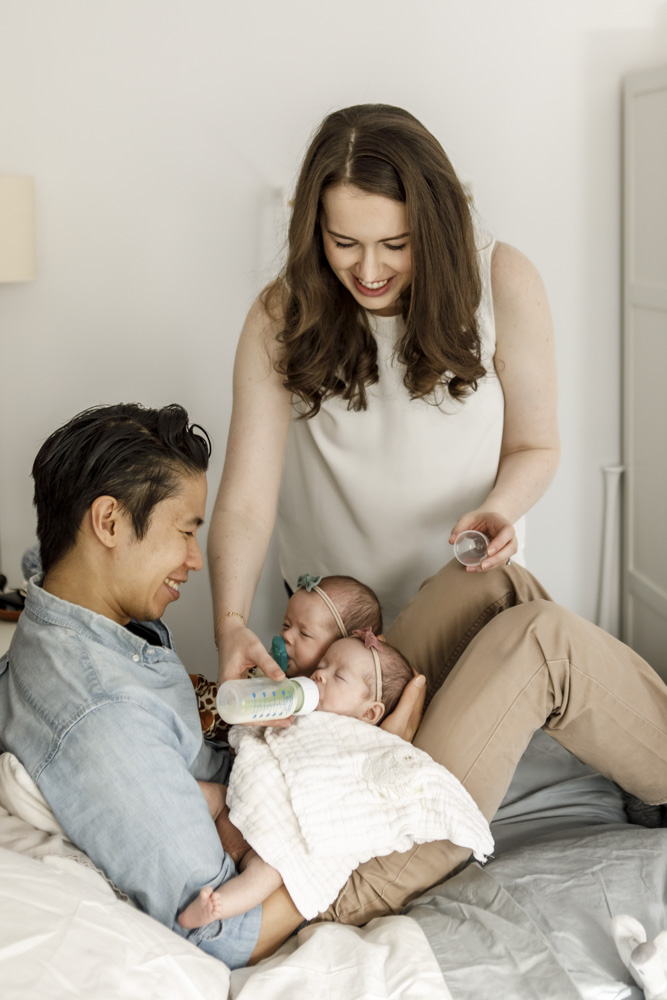 mom helping daddy bottle feed his little newborn baby girls