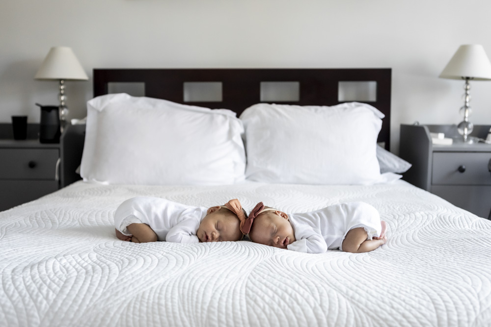 Newborn twins sleeping peacefully head-to-head on a white quilted bed with matching pillows and nightstands.