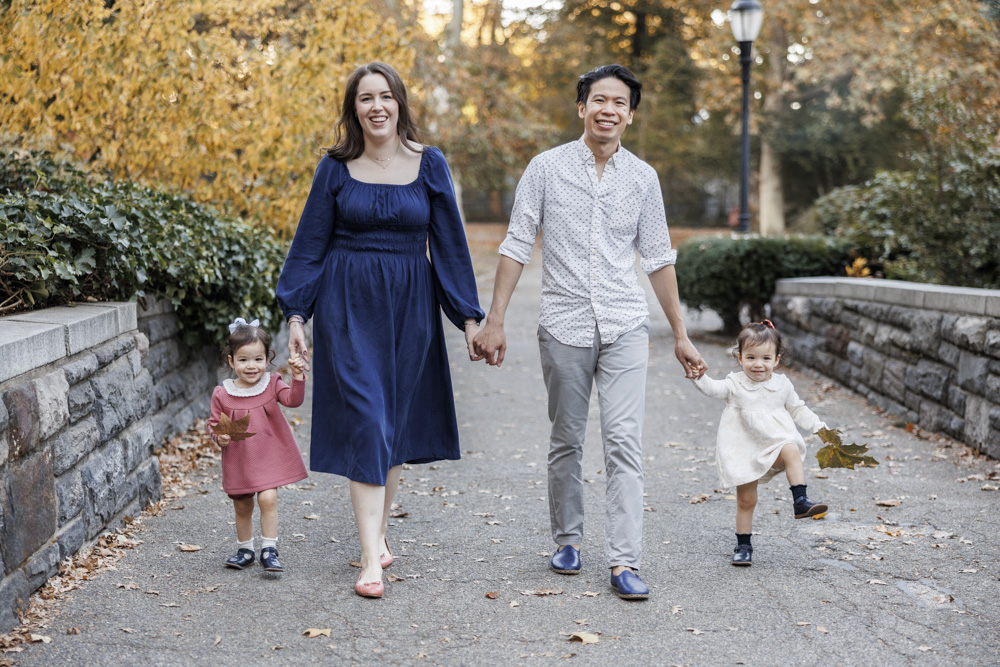 Happy family of four with twin toddlers posing in front of vibrant autumn foliage in Carl Schurz Park