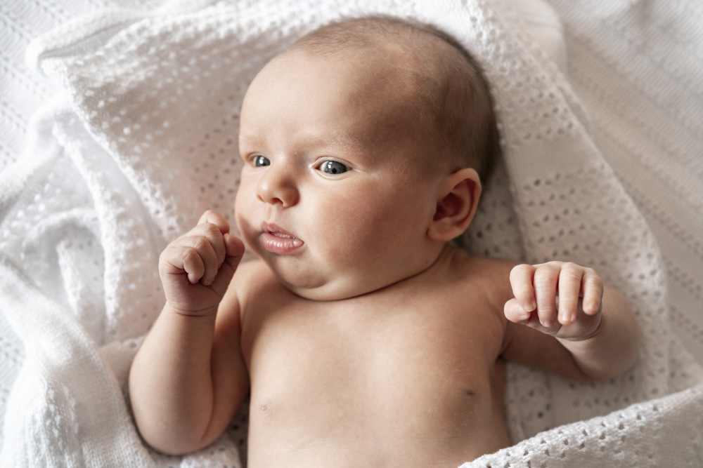 Newborn baby lying on white blanket with eyes open and hands raised.